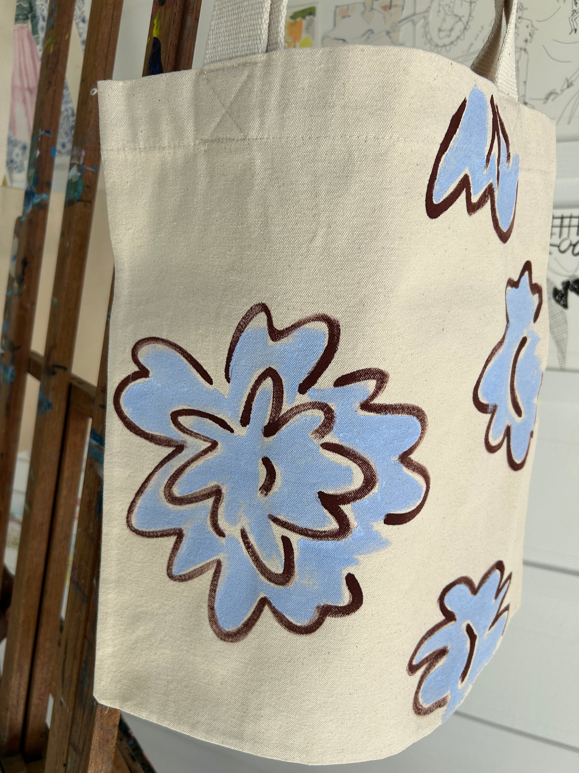 A sturdy 400mm × 420 mm canvas tote, each one painted by hand with durable fabric paints and sealed for longevity.